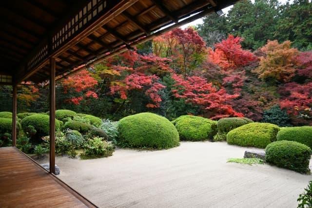 庭園には白砂が敷き詰められ、丸く刈り込まれたツツジの植え込みと奥に広がる樹々が美しい。この庭は、山の斜面を利用した上・中・下に分かれていて、堂内からは下の庭まで見通せない。広すぎず、狭すぎず、それでいて散策してみると思いがけない景色に出会う。そう、この庭は散策できるのだ。堂内からじっくり観賞した後は、ぶらぶらと庭内を歩いてみよう。